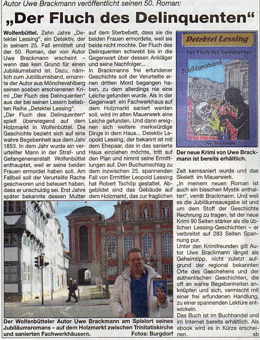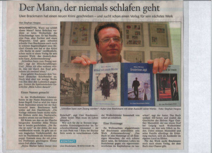 Es ist nicht leicht, sich seiner Umwelt mitzuteilen. Es gibt Menschen, die dies super gut können, indem sie kluge Reden halten. Ich gehöre eher zu denen, die dies schriftlich versuchen. Damit es für den Leser nicht langweilig wird, kam ich irgendwann auf die Idee, meine Ansichten in Geschichten zu verpacken. Bislang kamen dabei eine Krimiserie heraus, die in Bremen spielt und zur Zeit 16 Bände umfasst und eine weitere, in Wolfenbüttel spielende Krimiserie, mit momentan 55 Bänden. Darüber hinaus 3 Kriminalgeschichten um den Löwen von Braunschweig, der Nachkriegsroman 'Mein Leben danach', die deutsch - deutsche Wiedervereinigungsgeschichte 'Krötenwanderung', regionale Romane wie 'Sommerfrische in Cremlingen', 'im Schatten dunkler Erinnerungen' und einige Kurzgeschichten, die ich auf meinen Lesungen vortrage. Doch was nutzen die besten Geschichten, wenn keiner sie liest, weil mich niemand kennt. An dieser Stelle möchte ich mich für die Unterstützung durch die Braunschweiger Zeitung bedanken, die mit ihren Artikeln sicherlich dazu beiträgt, dass dieses Manko schon bald der Vergangenheit angehört.